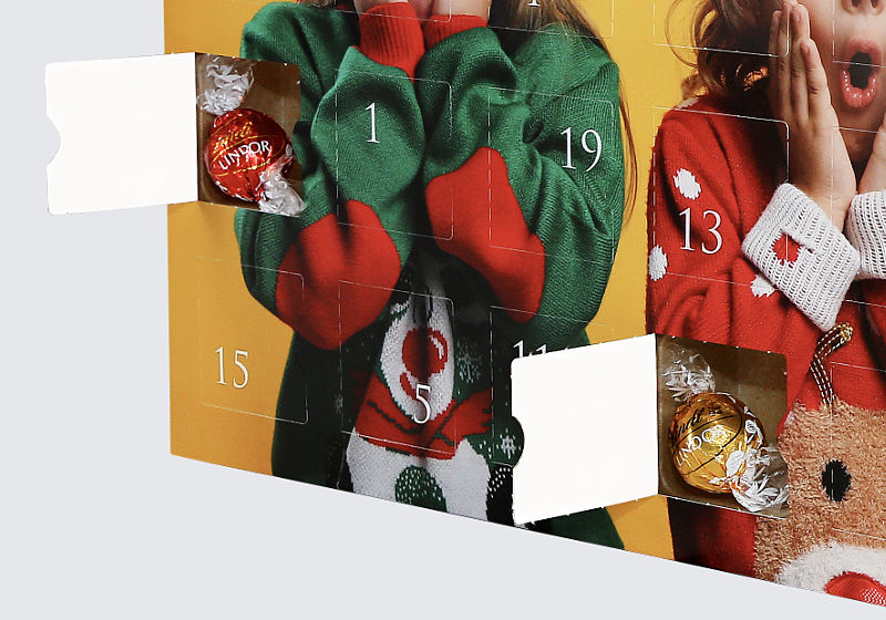NEU: Die Kalender werden in einem großformatigen Karton von ca. 30 x 42 cm produziert und sind auch am Rand bedruckt. Das Inlay ist aus Papyrus und nicht aus Kunststoff und bietet Platz für leckere Füllungen. Sie können aus 9 verschiedenen Schokoladenfüllungen oder der Variante zum Selbstbefüllen wählen.
